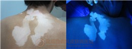 4、Wood灯:灯下见背部白斑边缘模糊不清,色素脱失严重
