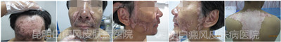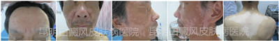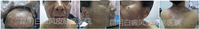 ▲现病史:患者11年前无明显诱因发现额头出现白斑,白斑逐渐增多扩大,曾在昆明某医院治疗2年,效果不佳,今日来我院就诊。