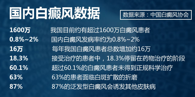 据中国白癜风协会数据统计显示,我国2016年约有超过1600万白癜风患者,我国白癜风发病率约为0.8%~2%,每年我国白癜风患者总数增加16万。而在接受治疗的患者中,18.3%停留在药物治疗的阶段,60.1%的白癜风患者未得到正规科学治疗,63%的患者面临白斑扩散的折磨,87%的泛发型白癜风会诱发其他皮肤病。
